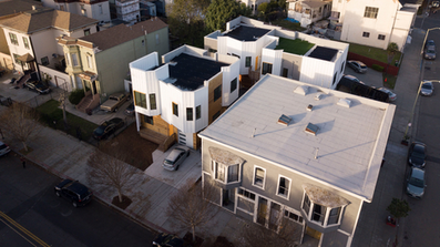 This three unit coliving project is the result of an integrative design process which creates a visually striking architectural expression and a highly functional and adaptable building plan which promotes long term equitable urban growth. As a developer driven project, it is an example of the unique development alchemy in Oakland, a subdivision of an existing 10,000 square foot lot into two parcels allows an increase on the base density allowance with one ‘free’ unit via a CUP process. Second, the project establishes a unique program model for a coliving user group being the first East Bay purpose-built ground-up building of its type in decades. Lastly, the project creates a creative and distinct architectural expression inspired by the historical housing context but rendered in modern materials and construction practices, the second of two projects on this stretch of 8th Street.